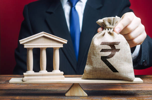 Businessman puts a indian rupee money bag on scales opposite to government building, bank, university. Lobbying interests. Taxes payment. Deposits, loans. Financial support for reforms. State debt